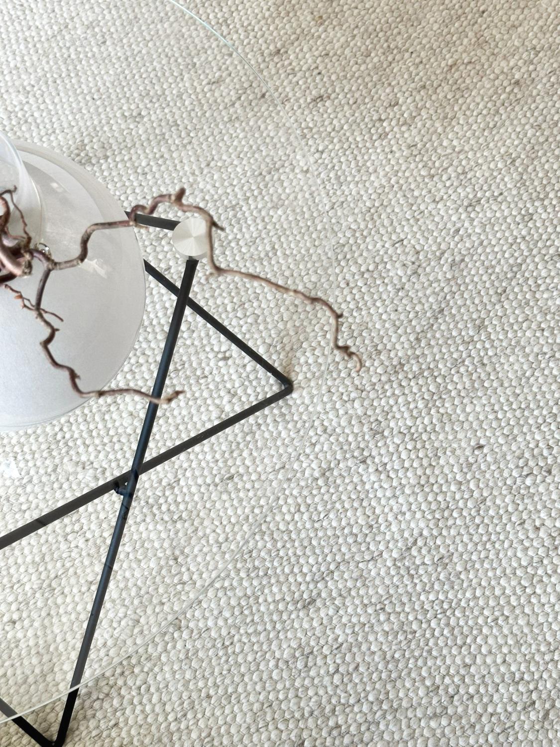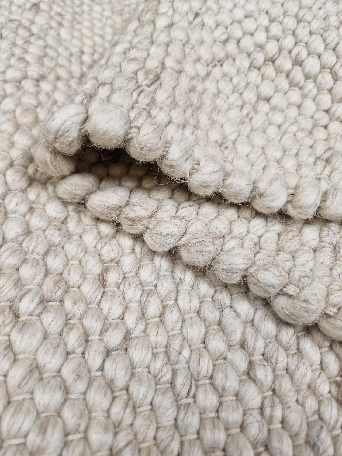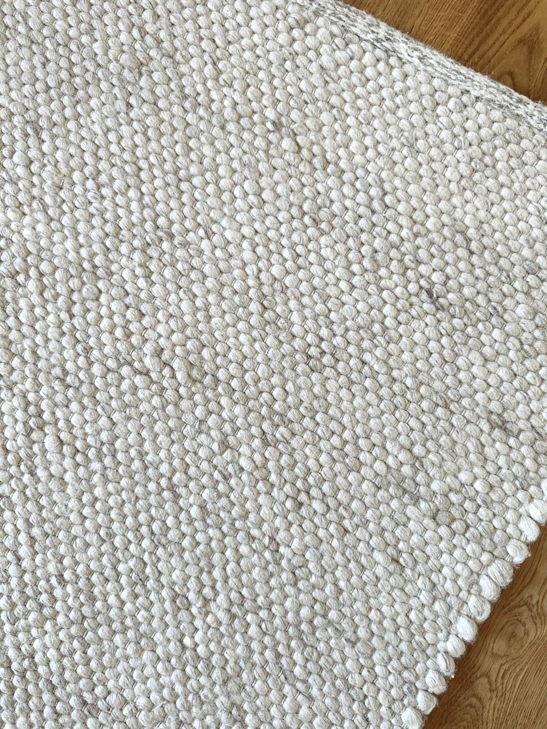 Anholt Champagne är en vacker handvävd ullmatta med en mjukt linnefärgad väft som växlar mellan ljusa och mörka naturtoner. Denna melerade effekt skapar en levande känsla och tillför ett naturligt inslag i rummet. Den vita varptråden ger en tydlig och elegant struktur, medan de tätare vävda bårderna längs kanterna skapar en stilfull och hållbar avslutning.