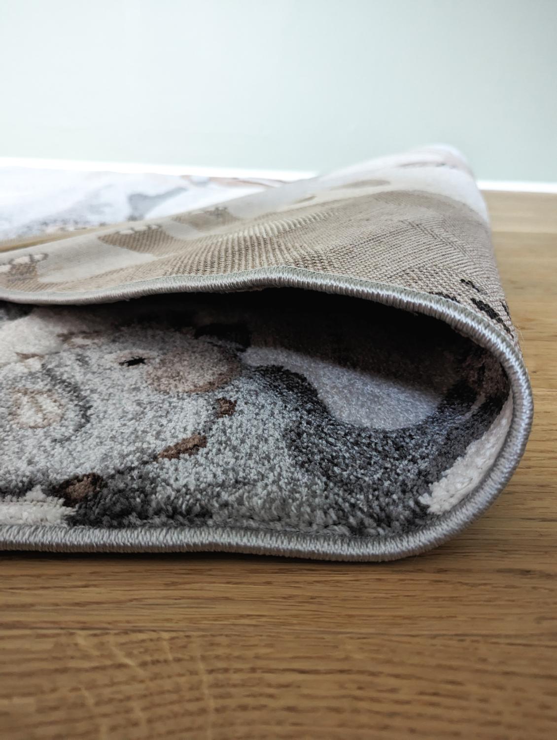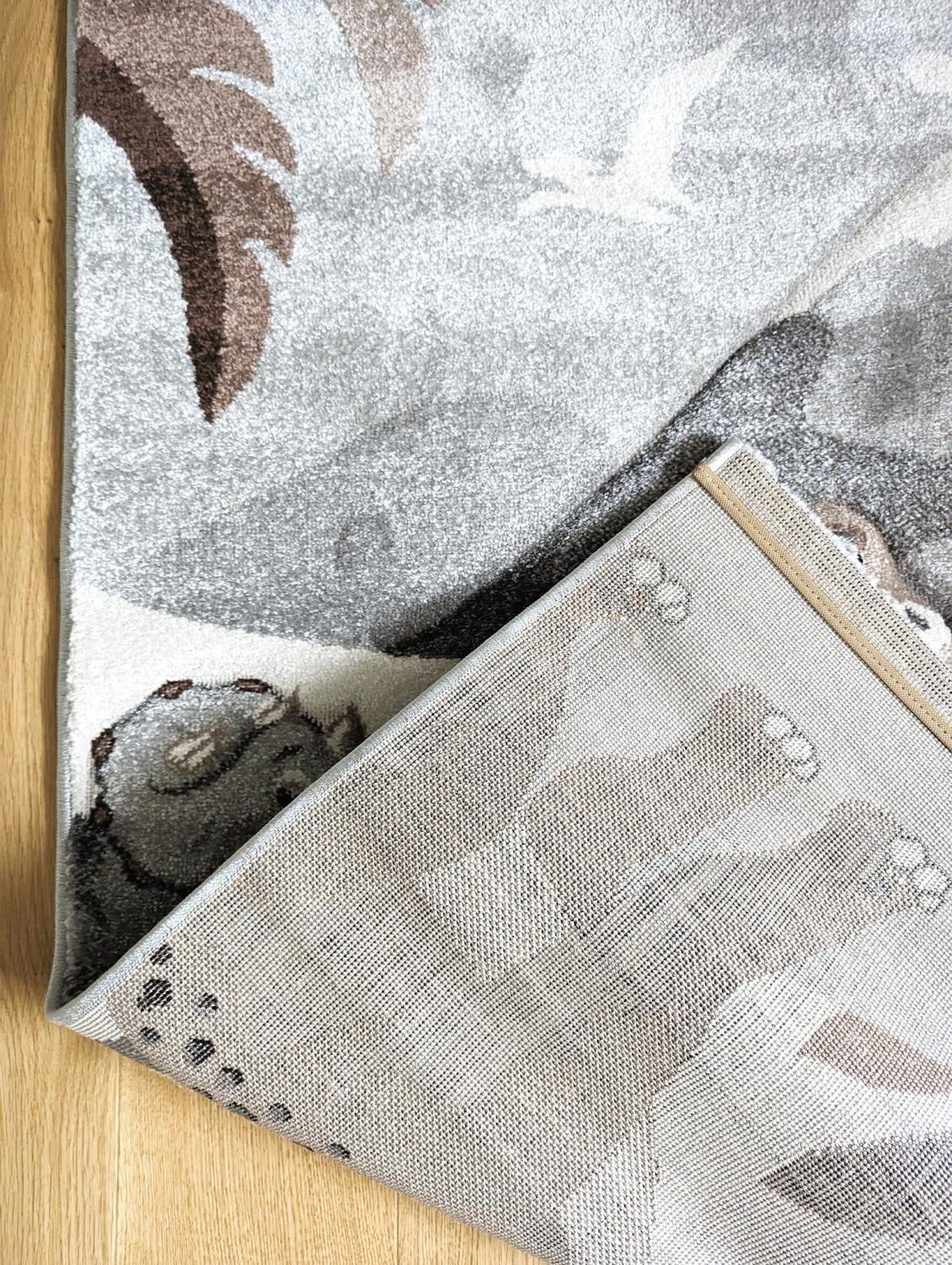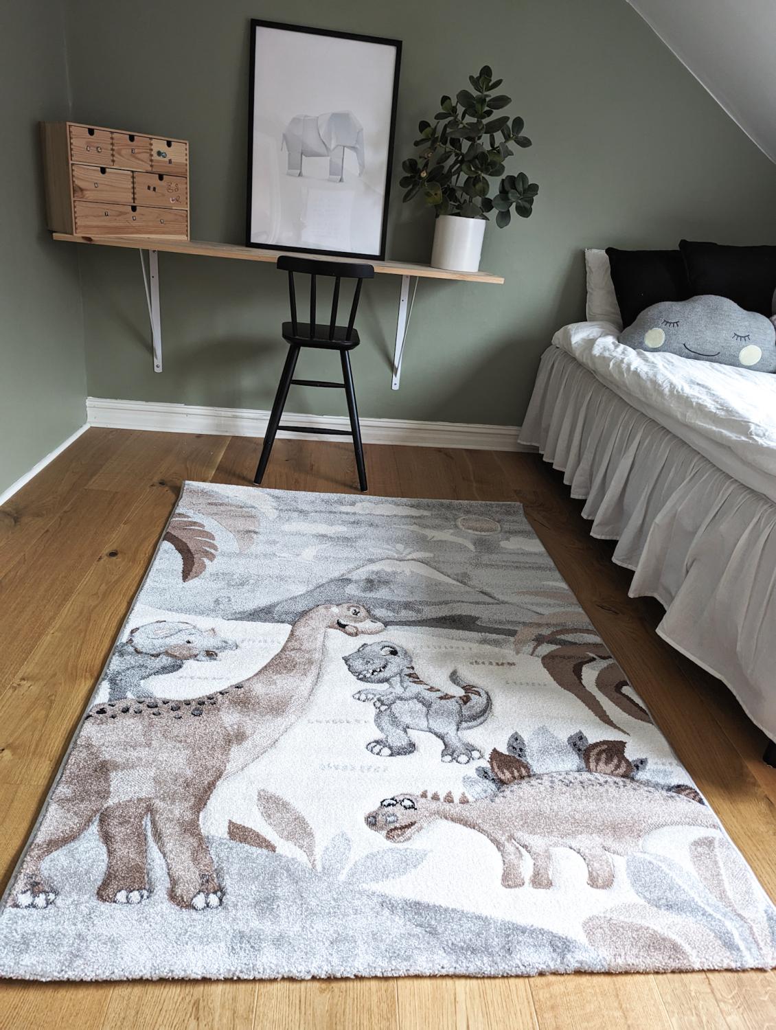 Res Tillbaka i Tiden med Vår Matta Dinosaurier. Vår matta Dinosaurier är inte bara en vanlig matta - den är en tidsmaskin som tar dig tillbaka till kritaperioden med sina naturinspirerade gråa toner och matchande langettering på långsidorna. Det är som att få en glimt av en försvunnen värld direkt under dina fötter. Vad som gör denna matta så speciell är dess lekfulla design som hyllar de magnifika dinosaurierna. Mitt på mattans yta möts du av glada och livfulla dinosaurier, som Brachiosaurus och Triceratops, som om de precis kommit ut ur en tidsmaskin. De är omgivna av bergstoppar och naturlandskap som ger en känsla av autenticitet och äventyr.
