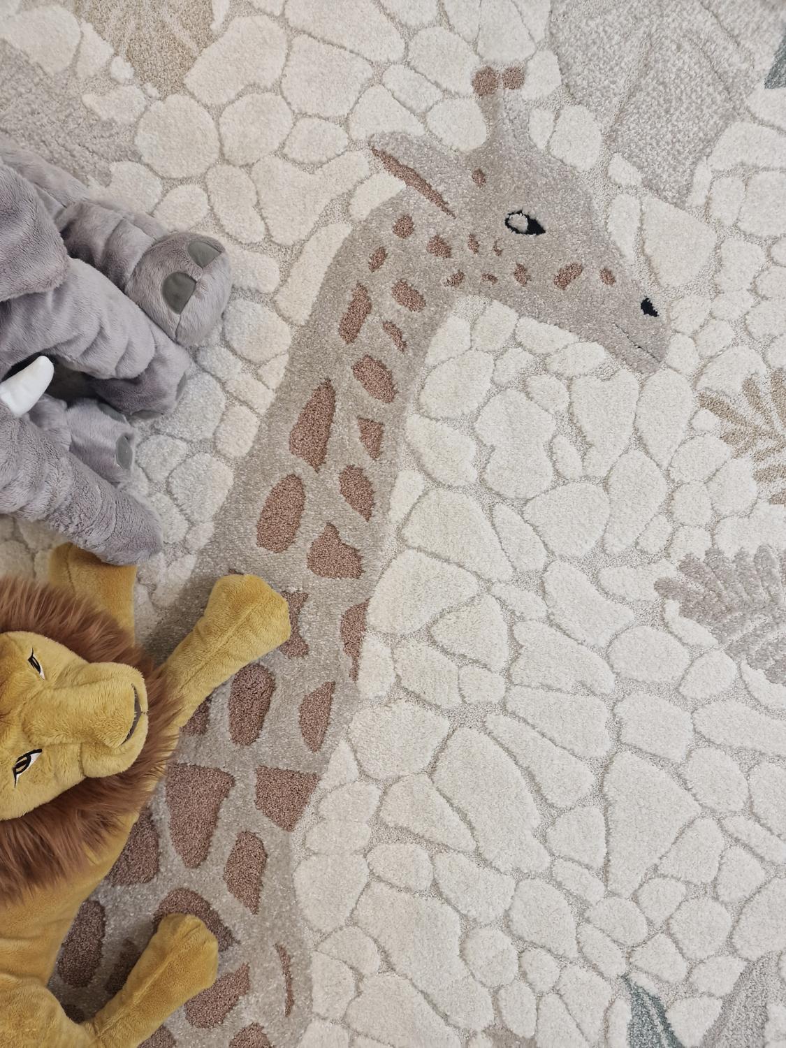 Mattan har en krämfärgad bas med ett utsnidat motiv med en giraff och fina löv i behagliga färger. Den diskreta färgpaletten skapar en lugn och rofylld atmosfär, medan det livliga mönstret tillför en lekfull och charmig touch till rummet. Dessa skandinaviska färger passar utmärkt i moderna hem och bidrar till en harmonisk inredning.