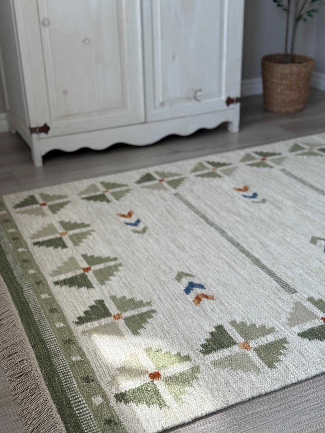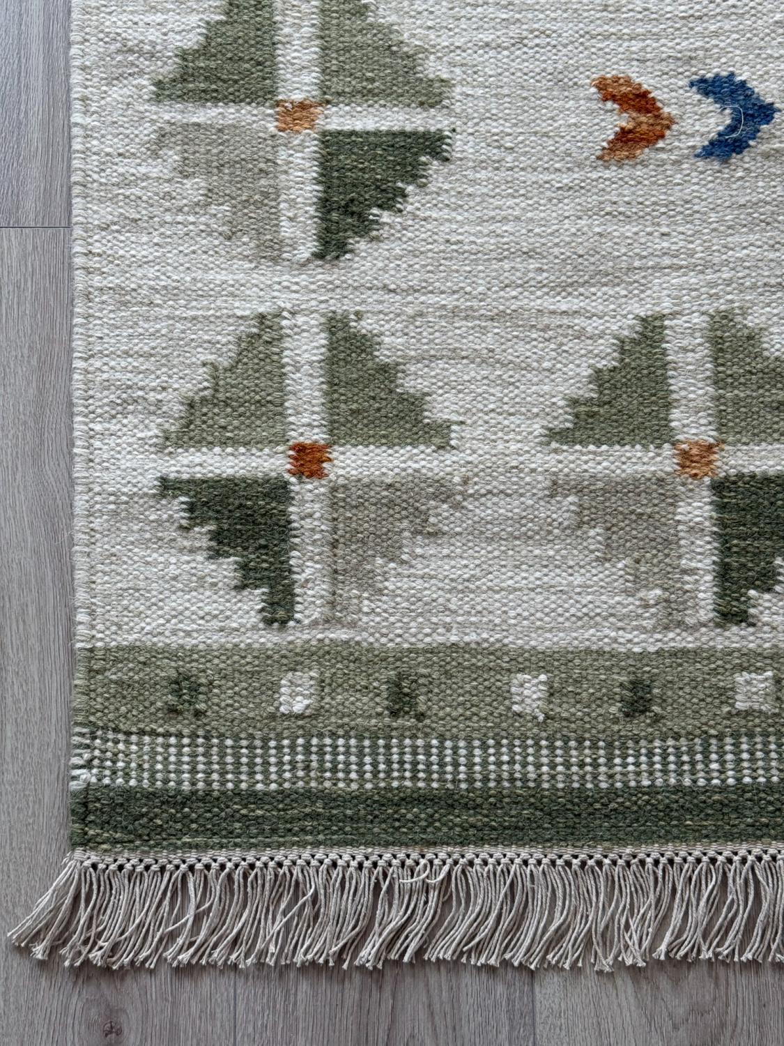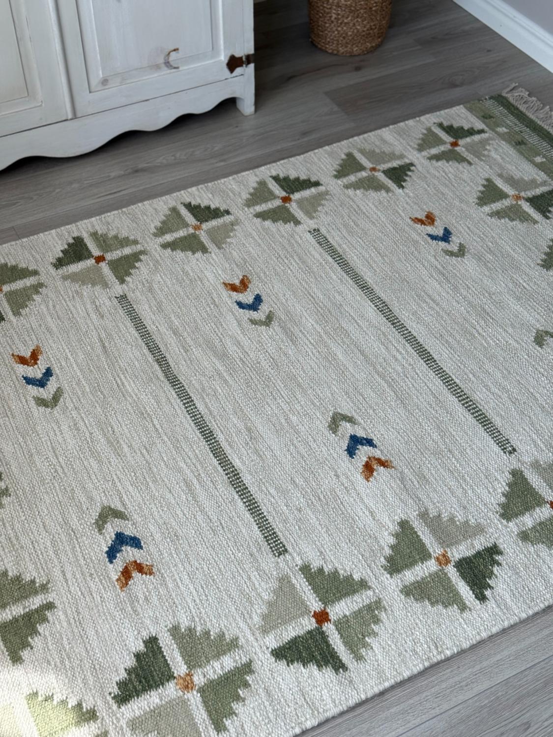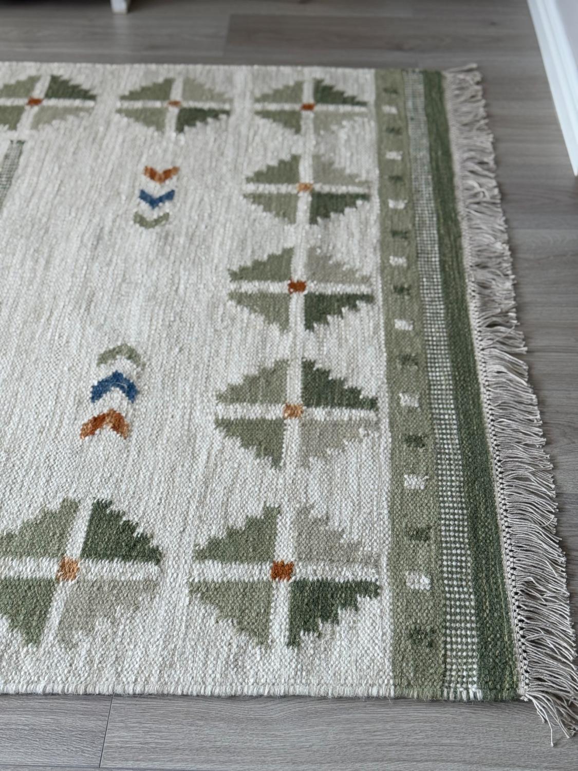 Vår matta Katthult Grön är inte bara en vacker inredningsdetalj utan även en hållbar och praktisk lösning för ditt hem. Denna matta är handvävd med den traditionella röllakantekniken, vilket ger varje matta ett unikt utseende och karaktär. Det röllakansinspirerade mönstret framträder elegant på den crèmefärgade botten, kompletterat med en bård i härliga gröna toner. Mattans kortsidor pryds av en klädsam frans i bomull som ger en sofistikerad avslutning.