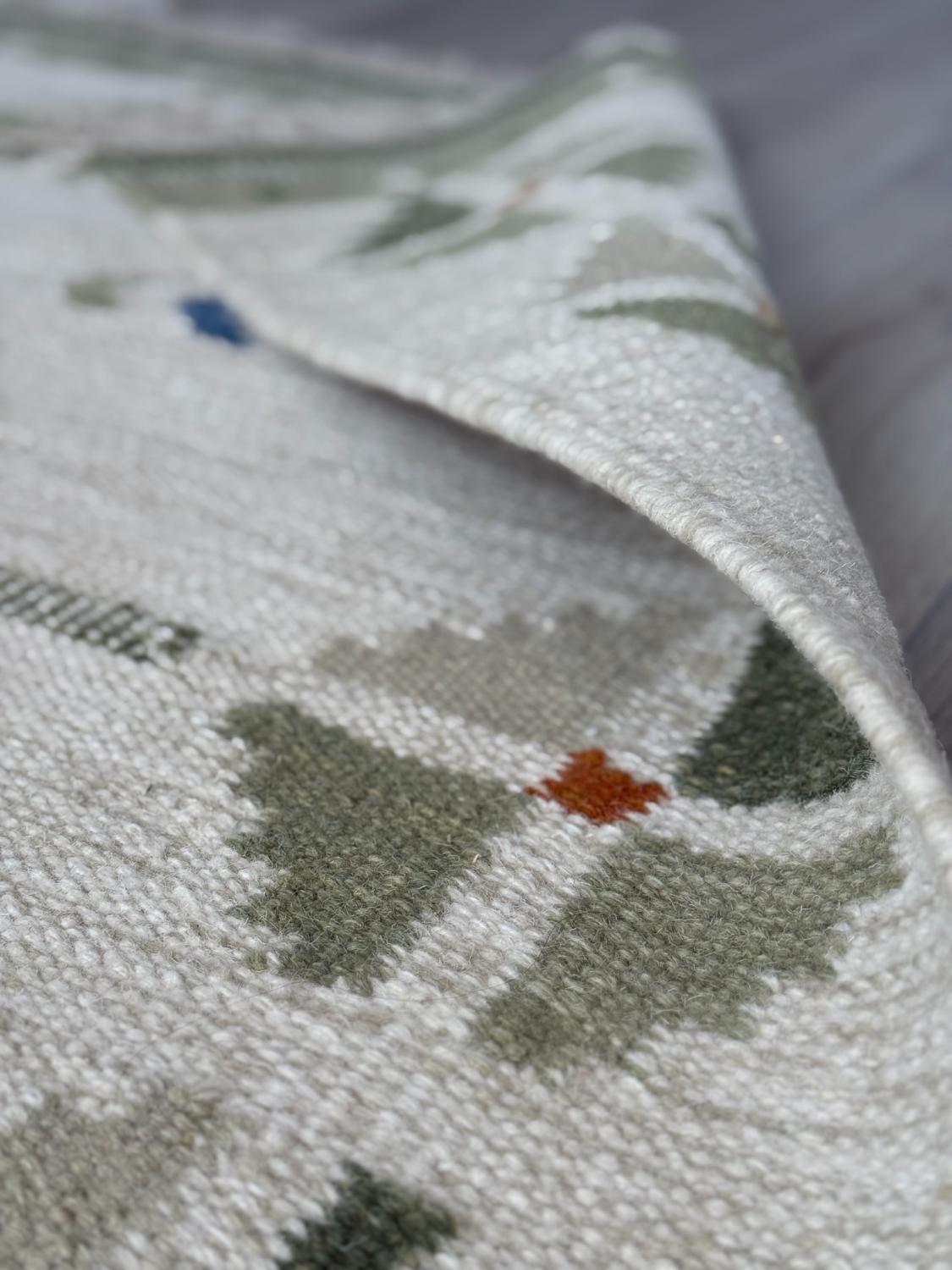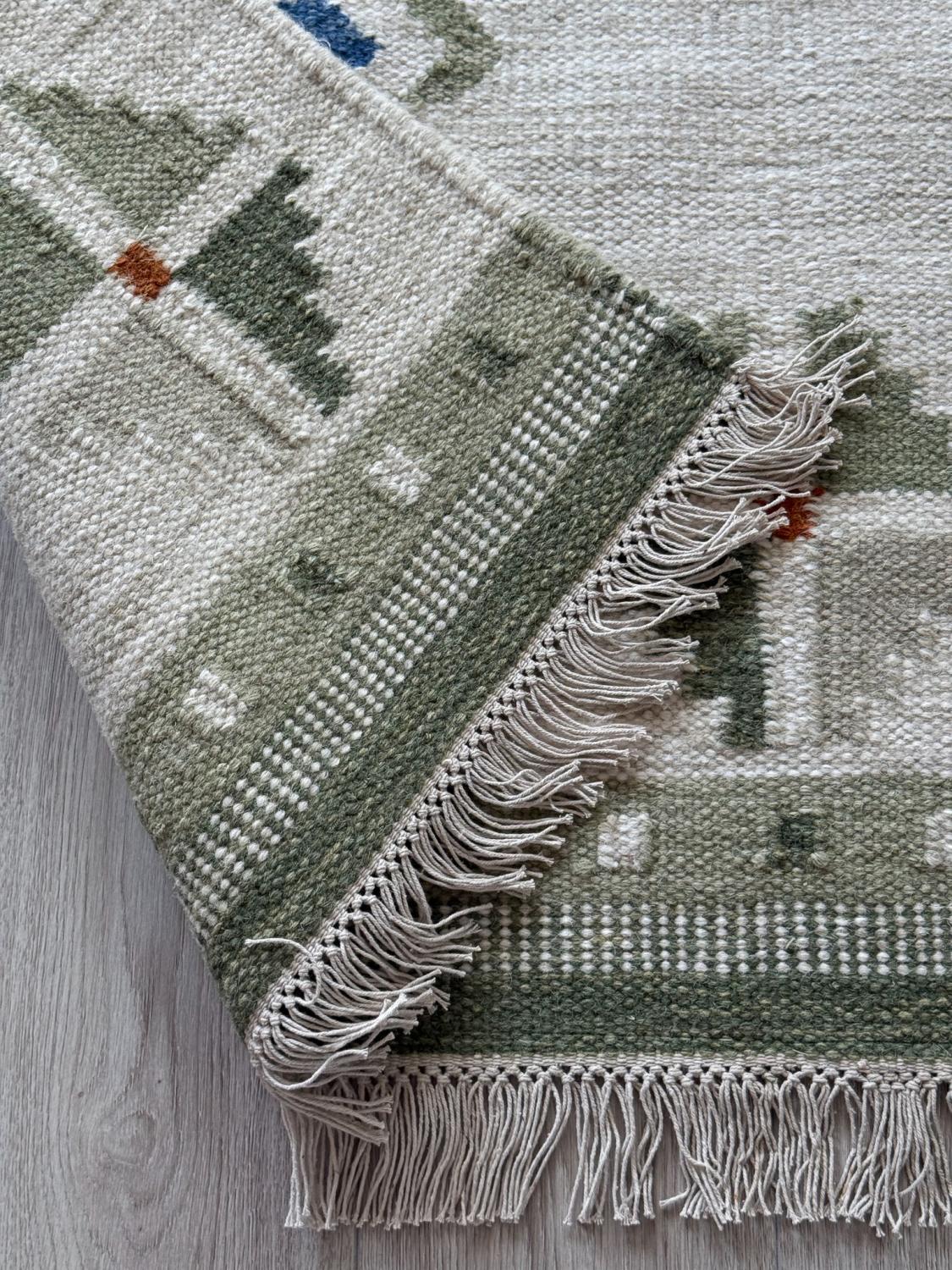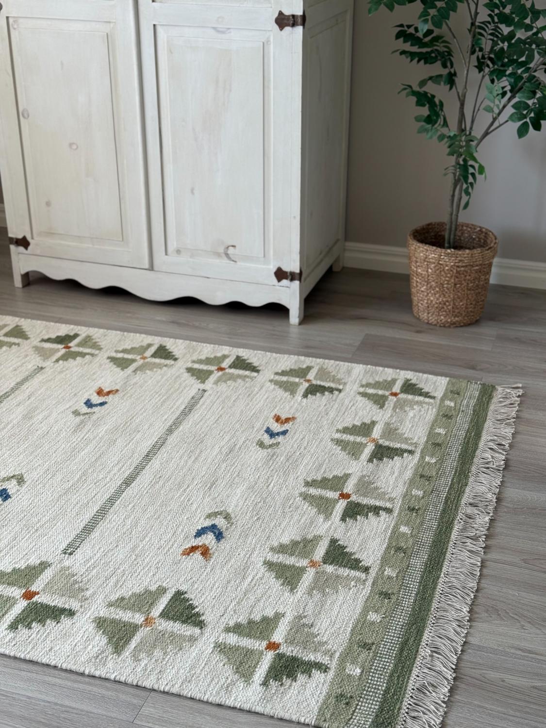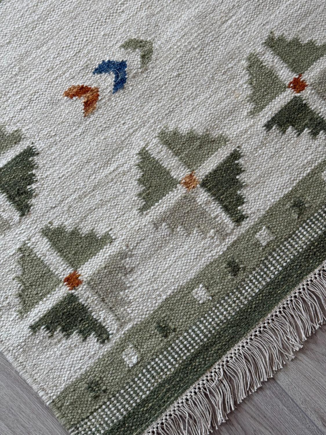 Vår matta Katthult Grön är inte bara en vacker inredningsdetalj utan även en hållbar och praktisk lösning för ditt hem. Denna matta är handvävd med den traditionella röllakantekniken, vilket ger varje matta ett unikt utseende och karaktär. Det röllakansinspirerade mönstret framträder elegant på den crèmefärgade botten, kompletterat med en bård i härliga gröna toner. Mattans kortsidor pryds av en klädsam frans i bomull som ger en sofistikerad avslutning.
