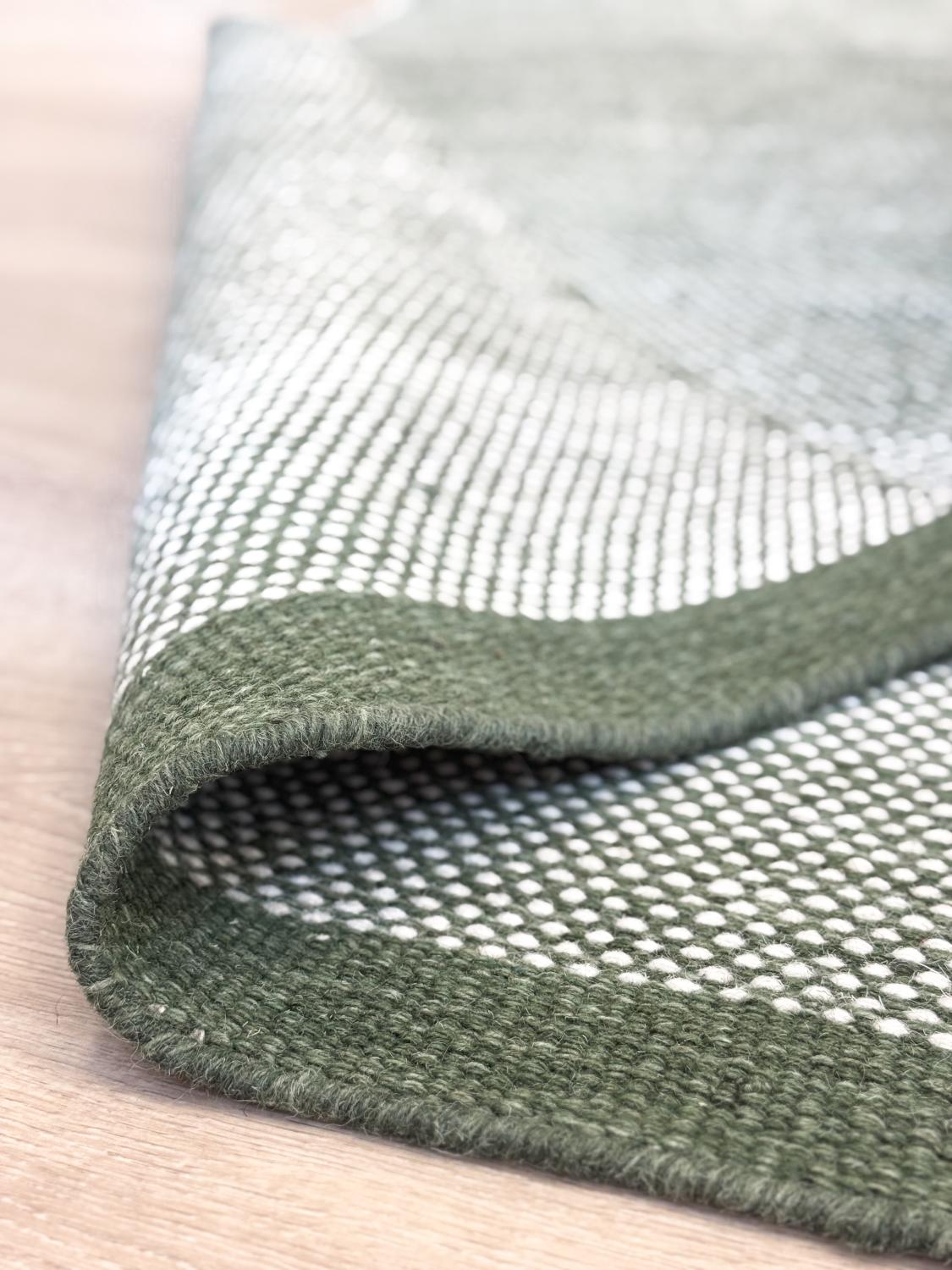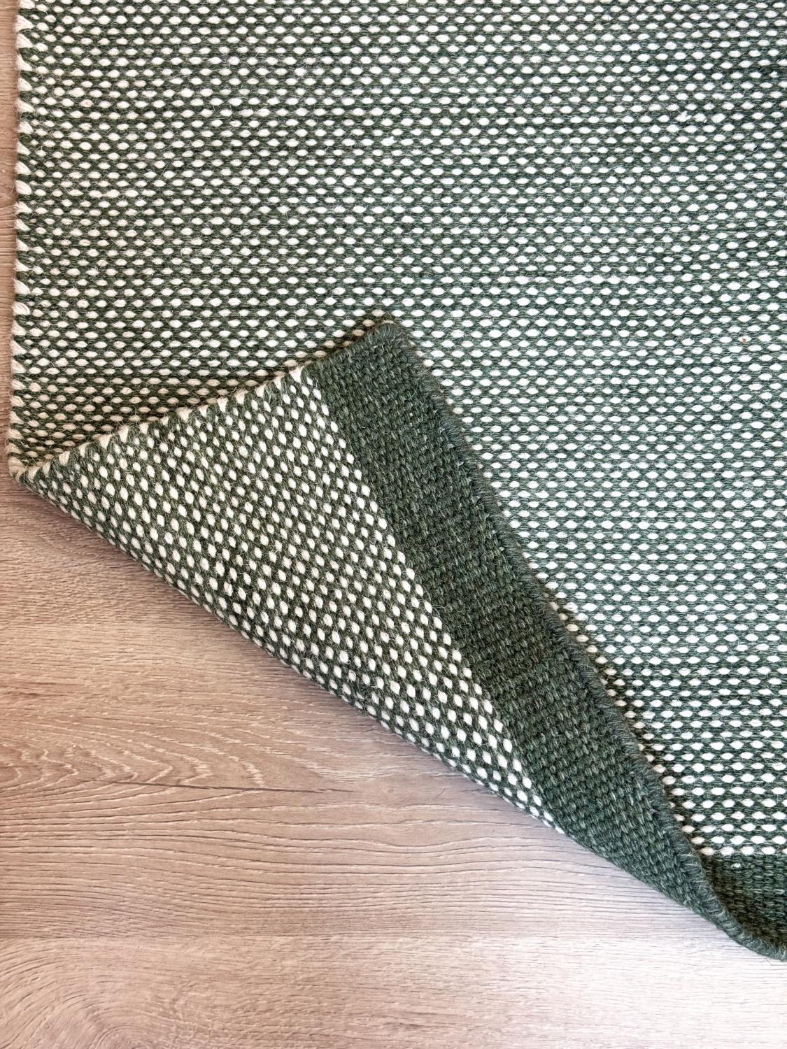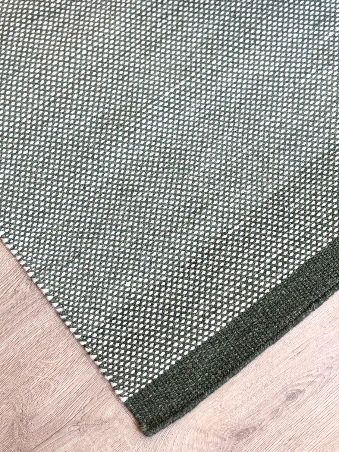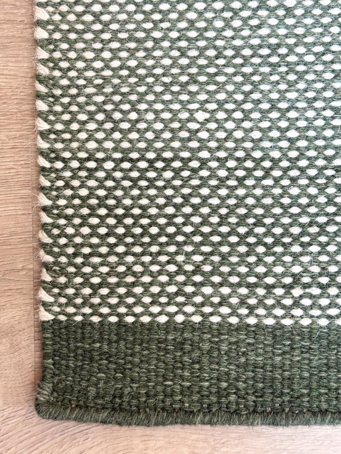Mönstret består av en finrutig, småprickig vävning i dova gröna och ljusa ulltrådar som ger en levande, melerad yta. Effekten är en diskret relief som både dämpar ljud och skapar en varm, ombonad känsla under fötterna. Den avslutande kanten är vävt i en djupare grön ton, vilket ramar in mattan och ger en tydlig, grafisk inramning mot golv och möbler.