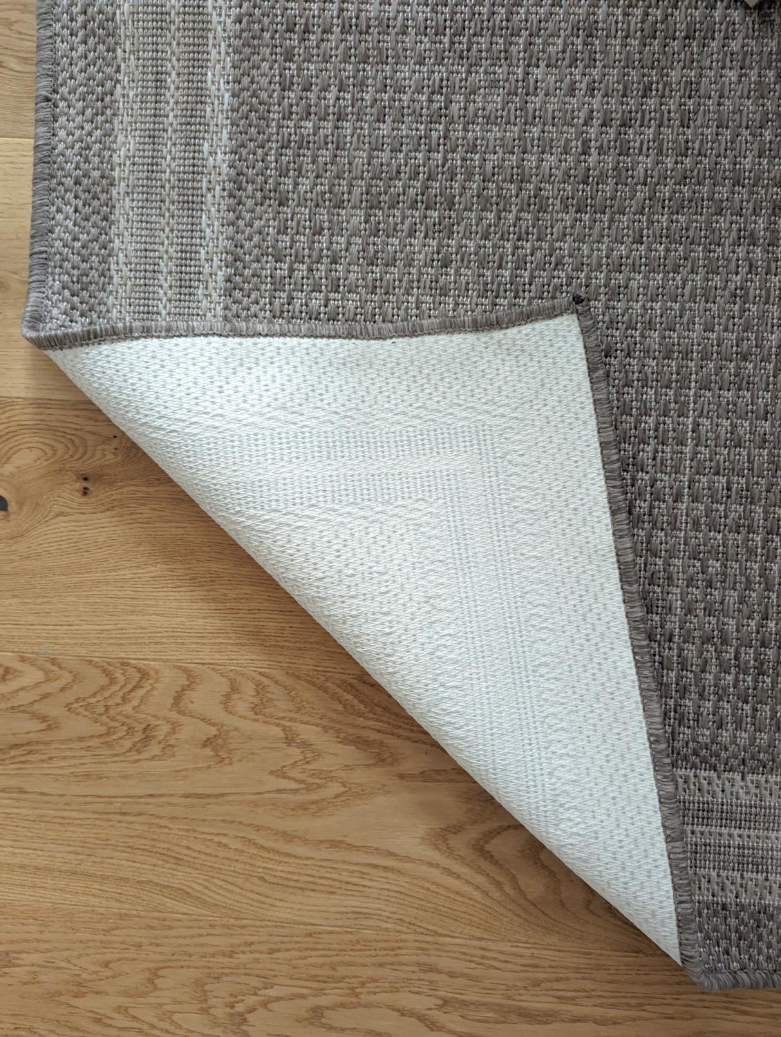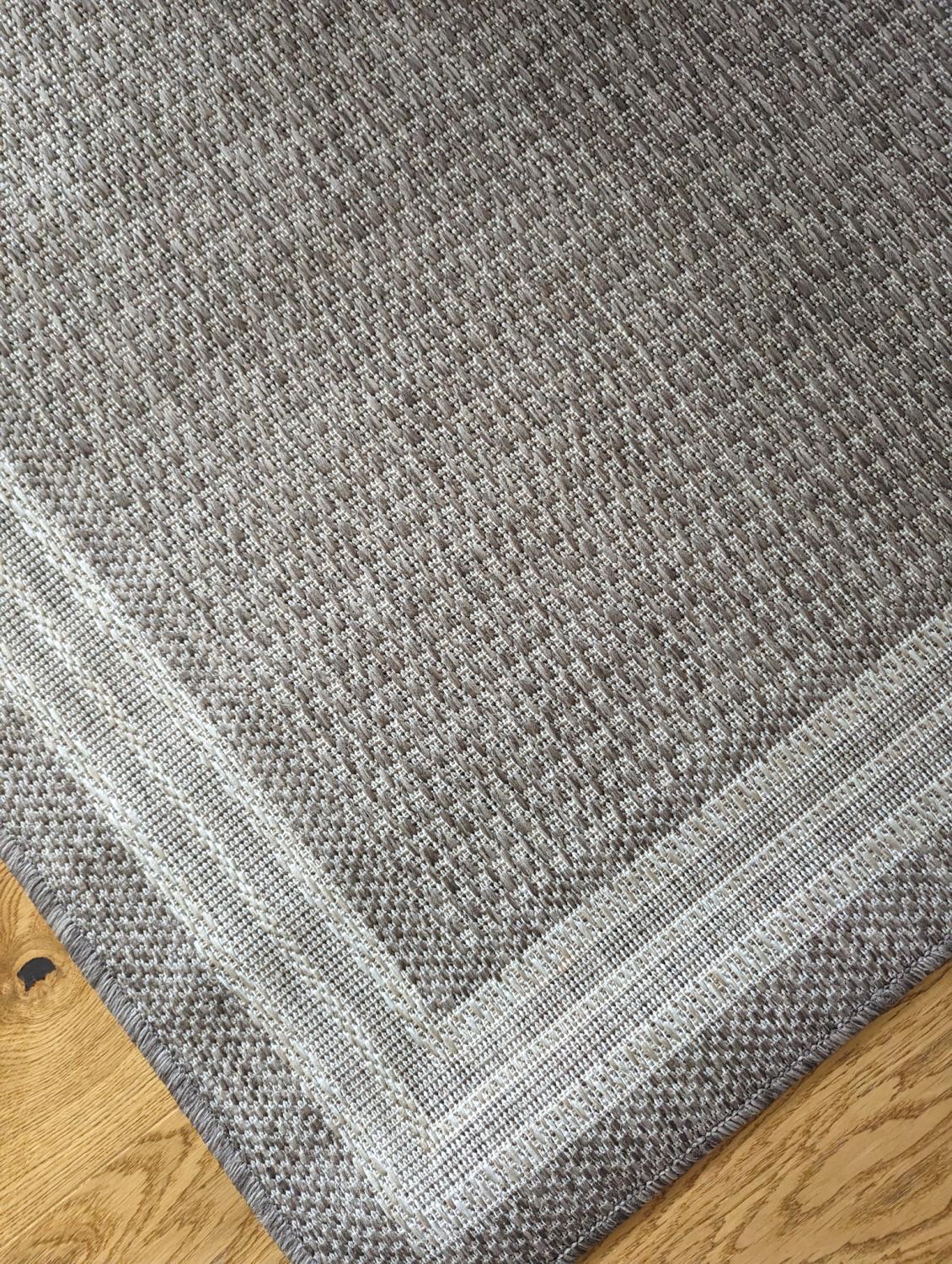 Med en linnefärgad bottenfärg och matchande langettering är Plaza-mattan både tidlös och mångsidig. Den sandfärgade borden runt mattan ger den ett modernt uttryck samtidigt som den gummerade baksidan säkerställer att mattan ligger stadigt på plats utan att glida runt.